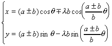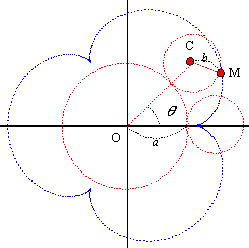定 義:半径bの円が半径aの定円の内側(外側)を周に沿って転がるとき、動円の円周の外部(内部)の点が描く軌跡